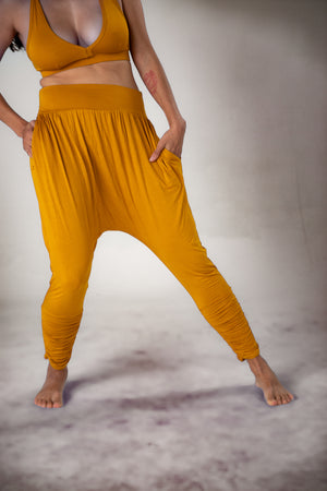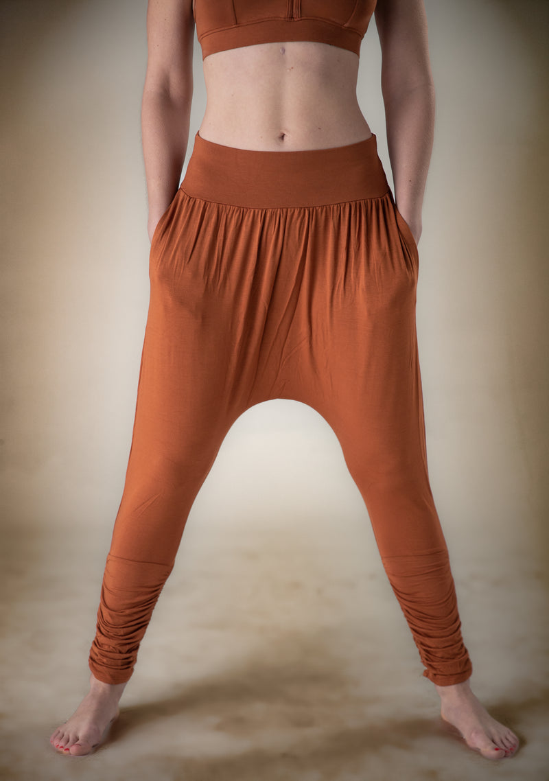 These harem pants are made of ethically chosen and silky soft plant based fabrics. Our wide band flatters the waistline and compliments the drape of the garment with the delicate detail of ruching at the calves; we’ve even added pockets! ...
